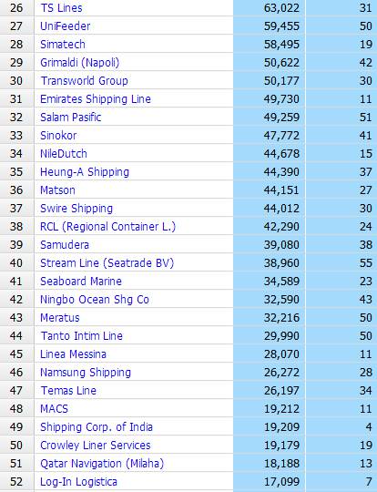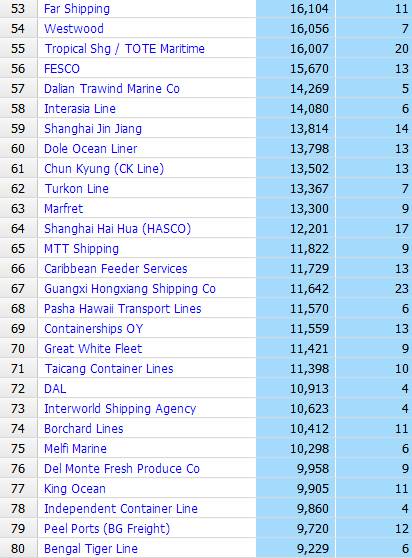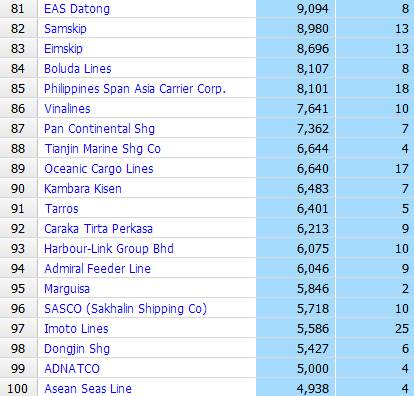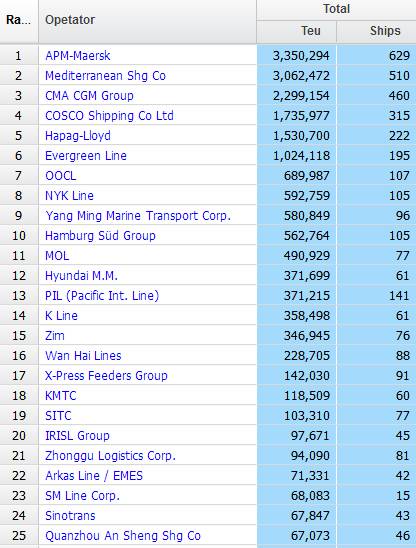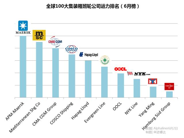 当前全球100大集装箱班轮公司运力排名(6月榜)前十的船公司分别为:APM-Maersk、Mediterranean Shg Co、CMA CGM Group、COSCO Shipping、Hapag-Lloyd、Evergreen Line、OOCL、NYK Line、Yang Ming Marine Transport Corp、Hambu